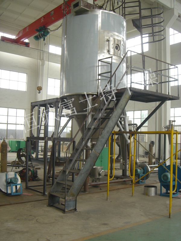 空氣經(jīng)過濾和加熱,進(jìn)入干燥器頂部空氣分配器,熱空氣呈螺旋狀均勻地進(jìn)入干燥室。料液經(jīng)塔體頂部的高速離心霧化器,(旋轉(zhuǎn))噴霧成極細(xì)微的霧狀液珠,與熱空氣并流接觸在極短的時間內(nèi)可干燥為成品。成品連續(xù)地由干燥塔底部和旋風(fēng)分離器中輸出,廢氣由風(fēng)機(jī)排空。