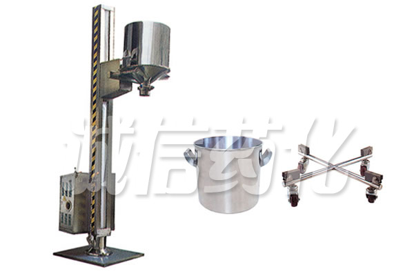 TJG 系列固定提升加料機由兩部分組成,即提升機及底座。提升機由機架、液壓提升系統(tǒng)及料門翻轉(zhuǎn)機構(gòu)組成。工作時,先將提升機的料門與料桶扣合,啟動提升操作桿,料門與料桶一起上升,啟動翻轉(zhuǎn)操作桿,料桶即可番轉(zhuǎn)180度,呈底桶向上姿態(tài)并移動到所需位置,利用料門上出料蝶閥,可很容易將物料加入所需的工藝設(shè)備中。